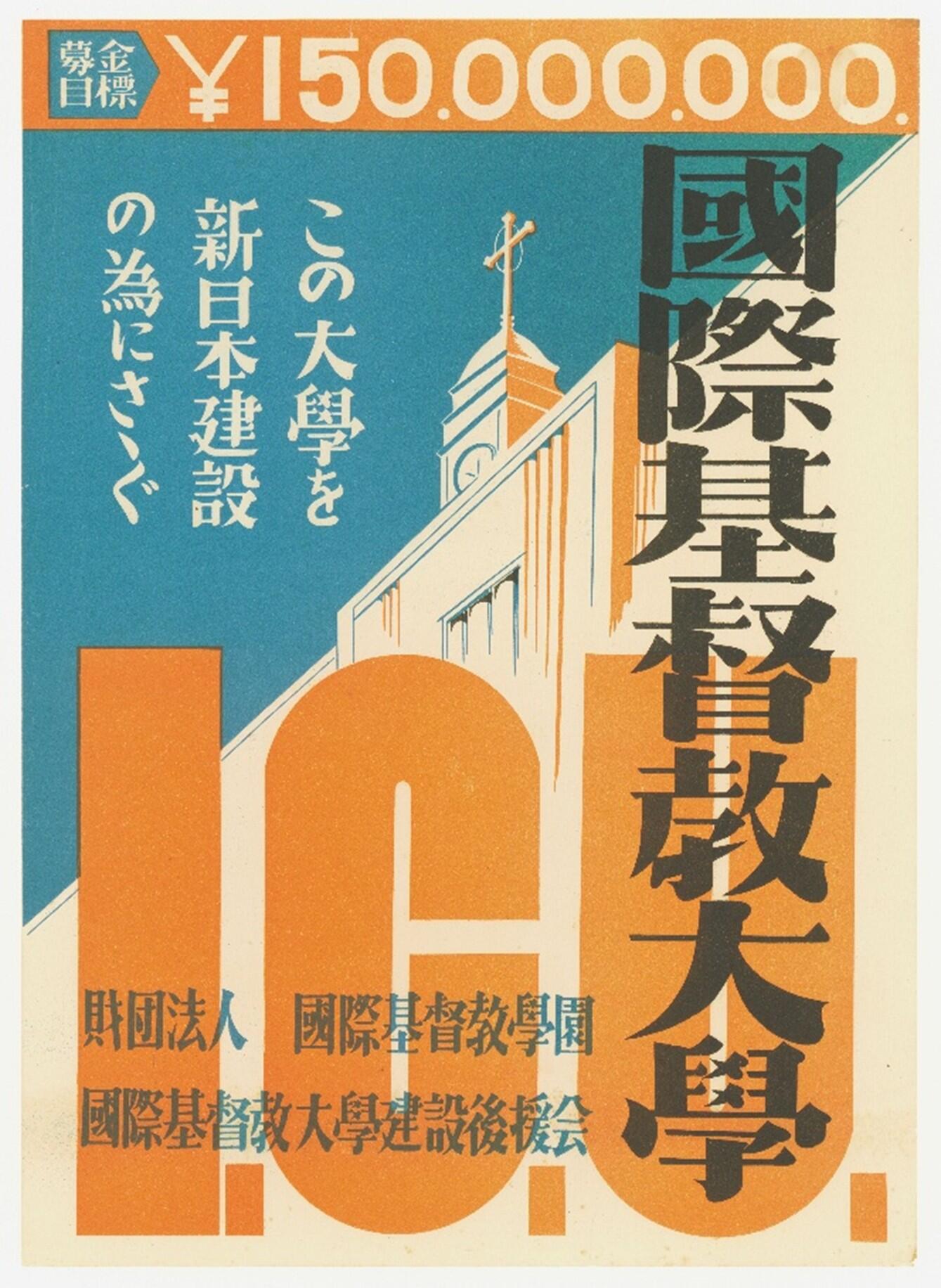 テレビやインターネットのない時代の募金広報活動は、主に紙媒体で行われました。小田部三平氏がデザインし、その時に使われたポスターが今でも残っています(資料4)。このポスターが1万枚印刷され、全国のに支部へと送付されました。「国際基督教大学」という大学名と「この大学を新日本建設のためにささぐ」というキャッチコピー、そして募金目標額。誰もみたことも、聞いたこともない大学名は新鮮で相当インパクトがあり、日本の将来を託すに値するとの印象を直感させるものでした。