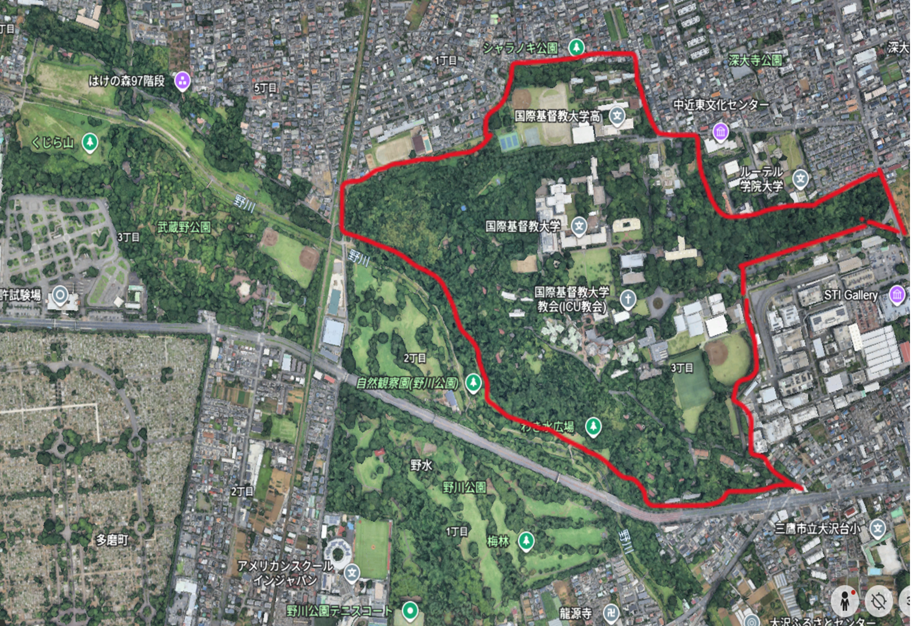 資料8:緑地部分が当初のキャンパス敷地(赤枠が現在)